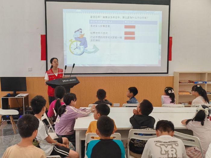 視察首站聚焦團(tuán)隊(duì)精心設(shè)計(jì)的特色課程。在法學(xué)啟蒙課堂,領(lǐng)導(dǎo)們駐足聆聽(tīng)。隊(duì)員們巧妙運(yùn)用案例分析與角色扮演,將抽象的法條化為孩子們身邊的故事。一場(chǎng)圍繞“校園權(quán)益”的模擬小辯論正在展開(kāi),孩子們化身“小法官”、“小律師”,稚嫩而認(rèn)真的發(fā)言中,閃爍著規(guī)則意識(shí)與權(quán)利觀念的最初萌芽。“普法教育從娃娃抓起,你們?cè)诤⒆觽冃奶锊ハ铝朔ㄖ蔚姆N子,意義深遠(yuǎn)。”一位領(lǐng)導(dǎo)在課后交流中深表贊許。