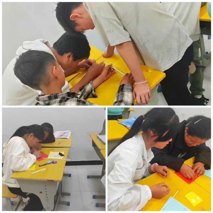 隨后播放的短片里,講道理我國(guó)重要旗幟的由來(lái),制作過(guò)程以及寓意和內(nèi)涵,同學(xué)們都聽(tīng)得十分認(rèn)真。最動(dòng)人的是手工環(huán)節(jié),孩子們幾人一組,用紅紙、卡片、小木棍忙碌著。有的小心翼翼剪五角星,有的專注地粘旗桿,還有的舉著半成品互相“炫耀”。當(dāng)幾十面小小的五星紅旗在課桌上立起來(lái)時(shí),孩子們臉上都洋溢著幸福的笑容。