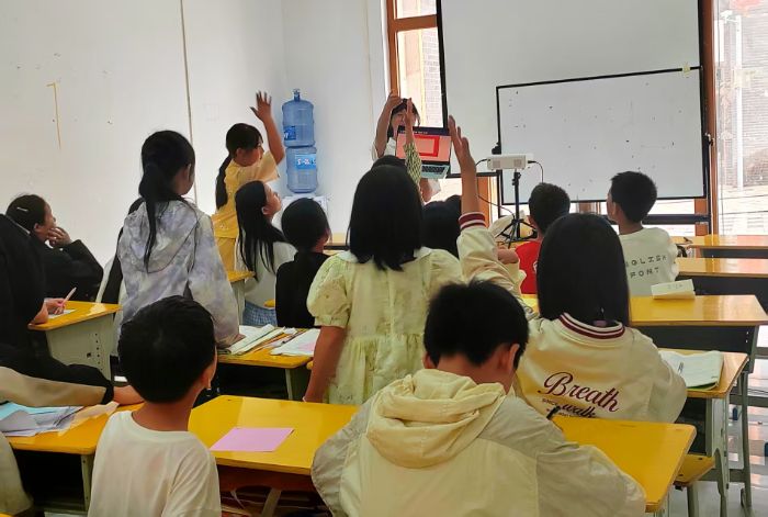 接下來(lái)我旁聽(tīng)了王詩(shī)涵老師的英語(yǔ)課,內(nèi)容主要為時(shí)間類(lèi)的詞匯和知識(shí)。老師在黑板上寫(xiě)下了月份、星期等詞匯,悉心地帶著孩子們一起拼讀,孩子們跟著老師一起讀單詞,聲音此起彼伏。當(dāng)孩子們有發(fā)音不標(biāo)準(zhǔn)時(shí),老師不急不躁,彎下腰一個(gè)個(gè)糾正口型,陽(yáng)光透過(guò)雨云的縫隙落在她肩頭,和孩子們仰起的笑臉相映,暖融融的。