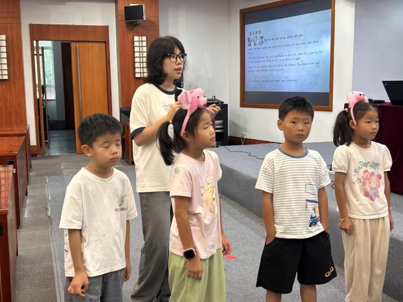 上午10時(shí)整,活動(dòng)在經(jīng)典繪本《The Three Little Pigs》的講解中拉開(kāi)序幕。主講志愿者楊洋通過(guò)PPT展示封面,拋出互動(dòng)問(wèn)題“Who is afraid of the big bad wolf?”,引發(fā)全場(chǎng)兒童齊聲響應(yīng)。分段朗讀過(guò)程中,志愿者每完成兩頁(yè)內(nèi)容即暫停,引導(dǎo)孩子們預(yù)測(cè)情節(jié)發(fā)展?,F(xiàn)場(chǎng)觀察顯示,低年級(jí)學(xué)生能熟練運(yùn)用“house”“strong”等關(guān)鍵詞參與互動(dòng),展現(xiàn)出積極的英語(yǔ)學(xué)習(xí)態(tài)度。