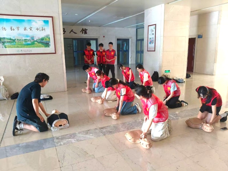 理論教學(xué)后,實操環(huán)節(jié)迅速展開。兩隊隊員混合編組,在模擬人身上交替練習(xí)。“手臂再直一些,用身體重量下壓!”“萬眾醫(yī)心”隊員余元元半蹲指導(dǎo),手把手糾正“暖陽陽”隊員的按壓姿勢。隨著練習(xí)深入,科教樓大廳回蕩起此起彼伏的計數(shù)聲,不同顏色的隊服在急救模型前交織成守護生命的同心圓。