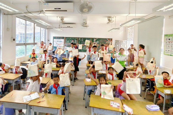 該團(tuán)隊講師通過“每2秒就有動物因塑料而死”的實例,把抽象的環(huán)保概念變成孩子們能理解的具體認(rèn)知。隨后,還科普了一些在日常中可以減少浪費的方法,并引導(dǎo)他們在布袋上自由繪畫,讓想象力為環(huán)保增添色彩。