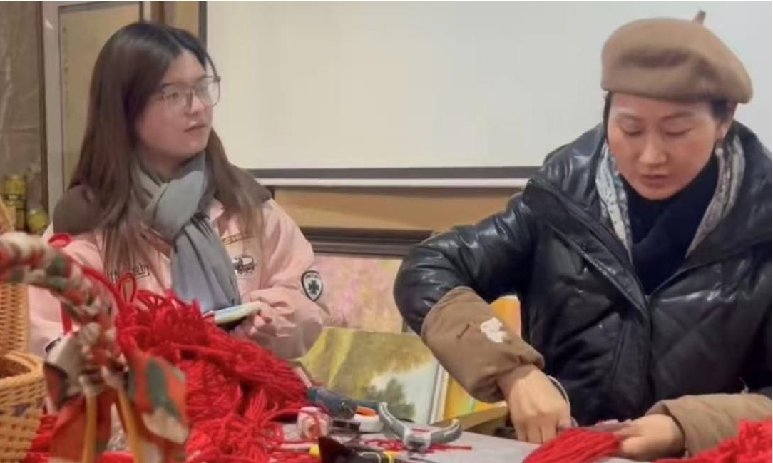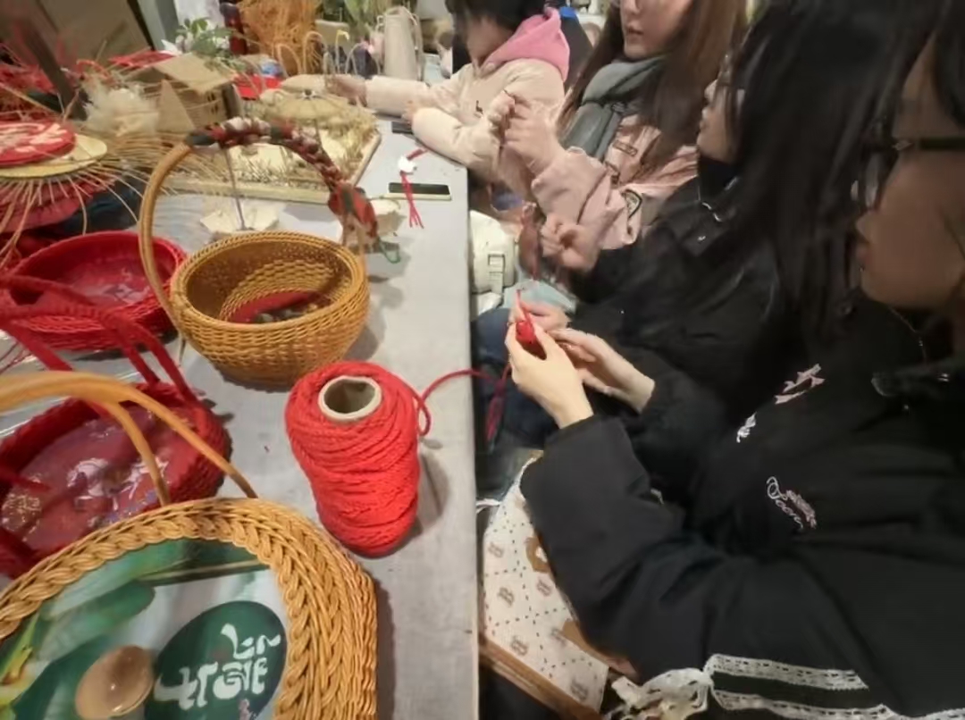 為讓團(tuán)隊(duì)對(duì)苧麻編織技藝有更真切的認(rèn)知,劉梅老師特意安排了動(dòng)手實(shí)踐環(huán)節(jié)。7名成員分工協(xié)作,部分同學(xué)專注卷制線球;其余同學(xué)則細(xì)致裁剪苧麻繩,為編織做好準(zhǔn)備。苧麻繩準(zhǔn)備好之后,劉老師給我們示范講解如何編織流蘇,每一個(gè)步驟都耐心講解。她格外強(qiáng)調(diào)細(xì)節(jié)把控:“打結(jié)處的線要一圈一圈均勻纏繞,既不能重疊,也不能松散,這是保證作品質(zhì)感的關(guān)鍵。”在老師的嚴(yán)格指導(dǎo)下,同學(xué)們精益求精,反復(fù)練習(xí)纏繞、固定的手法,最終成功完成多件流蘇作品,得到了劉老師的充分肯定。這場(chǎng)沉浸式體驗(yàn),讓團(tuán)隊(duì)深刻體會(huì)到非遺技藝慢工出細(xì)活的精髓,也對(duì)手工價(jià)值有了更直觀的理解。