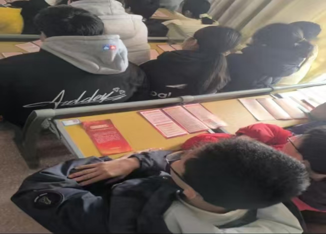鬃嶺鎮(zhèn)中學(xué)學(xué)生在普法宣講活動(dòng)現(xiàn)場(chǎng)領(lǐng)取并閱讀法治宣傳資料