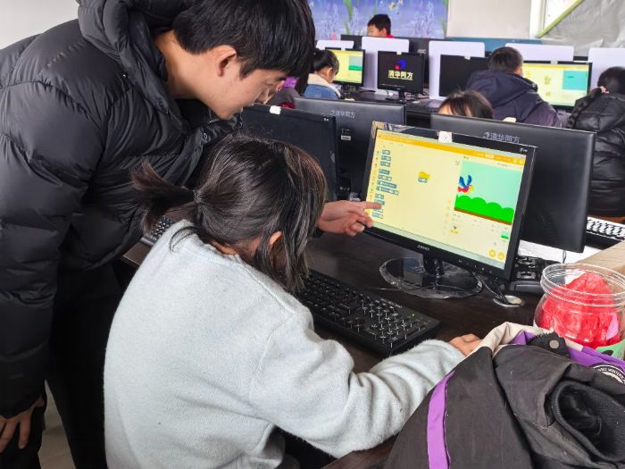 編程課堂上,隊(duì)員打破“編程晦澀難懂”的刻板印象,以Scratch圖形化編程為載體,用“搭積木”的方式引導(dǎo)孩子們走進(jìn)編程世界。隊(duì)員從簡(jiǎn)單的角色創(chuàng)建、指令拖拽入手,耐心講解循環(huán)、條件判斷等基礎(chǔ)編程邏輯,結(jié)合多個(gè)趣味案例,讓抽象的編程知識(shí)變得直觀易懂。孩子們專注聆聽(tīng)、積極嘗試,在隊(duì)員們的一對(duì)一指導(dǎo)下,親手完成屬于自己的簡(jiǎn)易編程作品,臉上洋溢著成就感,創(chuàng)新思維與動(dòng)手能力在實(shí)踐中得到有效提升。