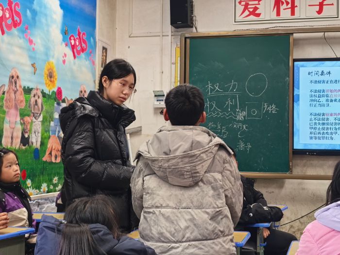 法律科普環(huán)節(jié)中,支教隊(duì)員結(jié)合小學(xué)生的生活實(shí)際,用通俗易懂的語(yǔ)言講解正當(dāng)防衛(wèi)的法律知識(shí),結(jié)合真實(shí)案例拆解正當(dāng)防衛(wèi)的構(gòu)成條件,引導(dǎo)孩子們分清合法與非法的界限,學(xué)會(huì)在遇到危險(xiǎn)時(shí)運(yùn)用法律武器保護(hù)自己,增強(qiáng)自我保護(hù)意識(shí)和法治觀念。隊(duì)員們通過(guò)互動(dòng)提問(wèn)、情景辨析等方式,調(diào)動(dòng)孩子們的參與積極性,讓法治觀念深入人心,助力孩子們健康成長(zhǎng)。