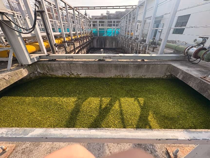 2月1日,團隊來到山東省濟南北控臘山污水處理有限公司。進入廠區(qū)前,成員們按要求佩戴紅色安全帽,沿廠區(qū)道路前行,兩側整齊排布著各類污水處理設備,“生產(chǎn)現(xiàn)場安全作業(yè)告知卡”“職業(yè)危險告知牌”等公告牌醒目矗立。運維部經(jīng)理、生產(chǎn)負責人李君巖帶領團隊參觀了纖維轉盤濾池、高效沉淀池等核心處理單元,并結合設備示意圖講解各工藝的功能定位和關鍵參數(shù)。在水樣檢測實驗室,成員們看到氨氮檢測、硝酸鹽氮檢測、總磷檢測等分區(qū)明確的檢測空間。管控室內,監(jiān)控屏實時顯示全廠運行數(shù)據(jù),李君巖介紹了公司在能耗控制與資源化利用方面的主要做法,雙方圍繞電耗優(yōu)化、技術升級及減污降碳協(xié)同增效等話題展開交流。