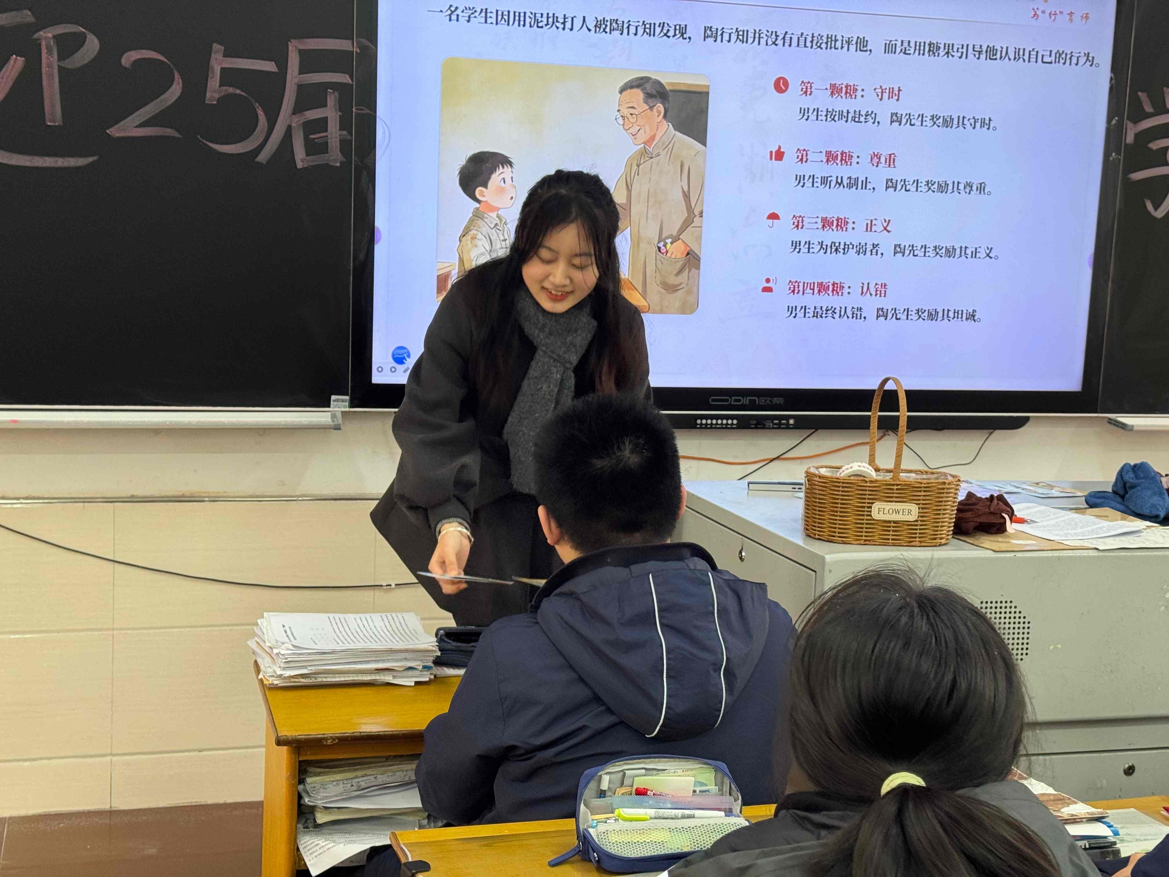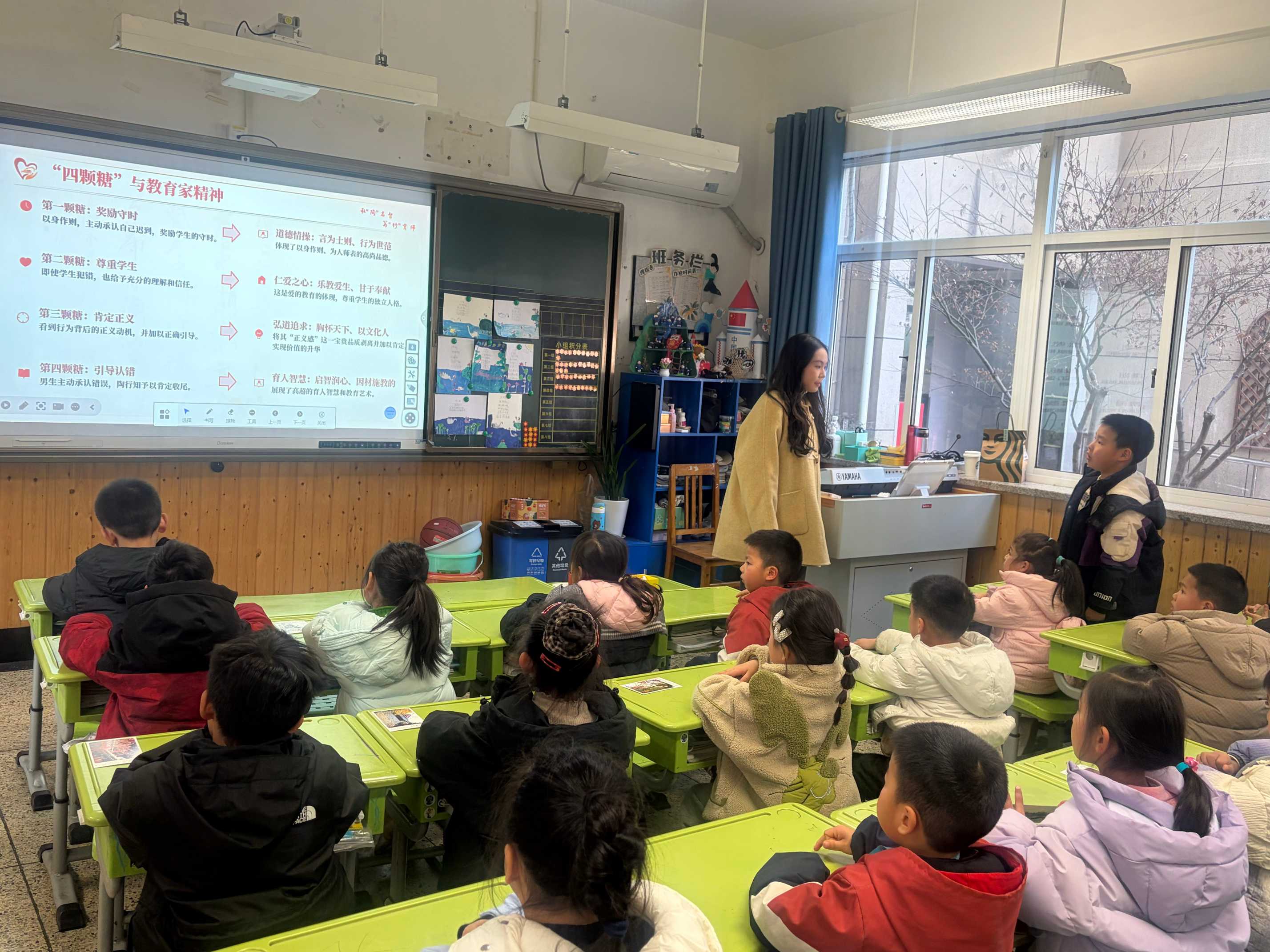 2月1日,宣講的第二站,團(tuán)隊(duì)成員走進(jìn)浙江省紹興市柯橋區(qū)鑒湖小學(xué)一年級(jí)的教室,通過情境模擬、角色扮演等方式,帶領(lǐng)孩子們穿越時(shí)空對(duì)話教育家精神。宣講結(jié)束后,孩子們已經(jīng)可以完整講述“四顆糖”的故事,這真切展現(xiàn)了宣講的育人實(shí)效。通過此次實(shí)踐,團(tuán)隊(duì)成員深刻領(lǐng)悟到教育家精神扎根現(xiàn)實(shí)的內(nèi)涵,切實(shí)堅(jiān)定了成為人民教師的信念,也深化了對(duì)教育學(xué)知識(shí)的理解。