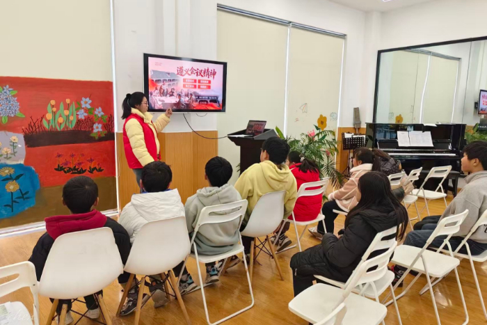 紅色文化教育板塊中,高低年級課程精準對接不同年齡段孩子的認知特點,讓紅色精神入腦入心。楊老師為低年級孩子帶來“五面旗幟”專題課程,通過圖文展示、實物講解等方式,詳細介紹了每面旗幟的樣式、顏色構成,深入解讀其設計初衷與象征意義,同時講述了旗幟設計者們的愛國故事與奉獻歷程。孩子們聽得聚精會神,在提問互動中加深對旗幟的理解,愛國情懷與民族自豪感在潛移默化中萌芽。另一邊,王老師為高年級學生打造了遵義會議精神專題課堂,她結合歷史背景,繪聲繪色地講述革命先輩在艱難險阻中召開遵義會議、挽救革命的光輝歷程,配合振奮人心的歷史視頻片段,讓孩子們直觀感受革命先輩的堅定信念與奮斗精神,紅色基因在課堂中代代相傳。