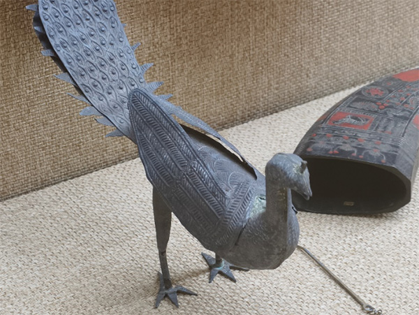 帶著這份敬畏,實(shí)踐團(tuán)首站步入重慶三峽博物館?!段髂厦褡迕袼罪L(fēng)情》展廳內(nèi),一座現(xiàn)代苗族銀孔雀雕塑令眾人駐足凝望。銀匠以鏨為筆,以銀為墨,運(yùn)用拉絲、編結(jié)、鏨刻等非遺絕技,將孔雀的輕盈尾羽與銀材的剛?cè)岵?jì)融為一體。那舒展的羽翼間,仿佛棲息著苗族古歌中的吉祥與美好,也凝固了匠人對自然的虔誠禮贊。這不僅是技藝的巔峰,更是文化的凝結(jié)——博物館的殿堂,讓來自四面八方的觀者得以穿越山水,與苗族文明悄然相遇。