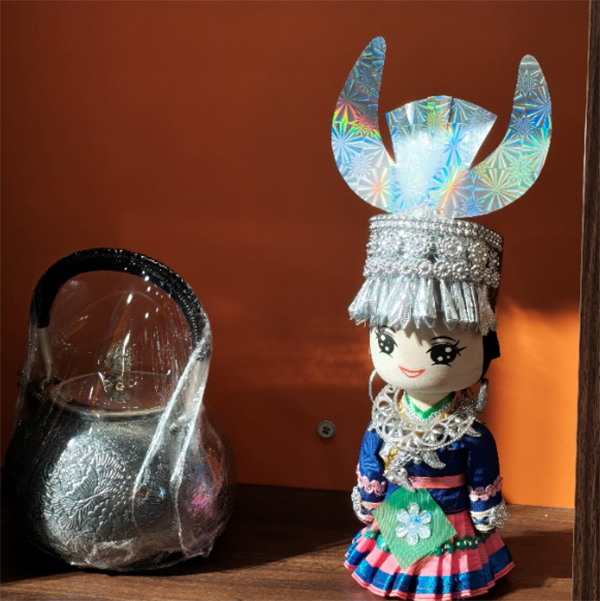 步入苗族九黎文化館,滿目銀光撲面而來。全館展出的各類銀飾與手工藝品,宛如一座微縮的苗族博物館。那些頭戴華麗銀冠的苗族娃娃,雖只有雙掌大小,卻將苗銀的繁復(fù)精微盡收其中——高聳的銀角象征祖先的威嚴(yán),層疊的銀花寓意生命的繁盛,垂墜的銀鈴則藏著少女步履的輕盈。每一個娃娃都是一粒文化的種子,被南來北往的游客帶往天南海北,讓苗族的審美悄然生根。