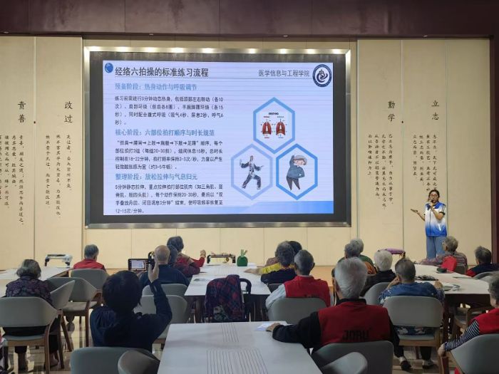 針對(duì)老年群體身體機(jī)能特點(diǎn),志愿者開展經(jīng)絡(luò)六拍操教學(xué)服務(wù)。教學(xué)過(guò)程中,志愿者對(duì)經(jīng)絡(luò)六拍操的動(dòng)作要領(lǐng)、養(yǎng)生原理及各動(dòng)作功效進(jìn)行說(shuō)明,通過(guò)慢速示范、動(dòng)作拆解的方式進(jìn)行教學(xué),同時(shí)采取分組指導(dǎo)的形式,對(duì)老年群體的動(dòng)作進(jìn)行規(guī)范糾正,幫助參與老人掌握基礎(chǔ)動(dòng)作流程。現(xiàn)場(chǎng)老年群體跟隨示范進(jìn)行練習(xí),完成基礎(chǔ)健身實(shí)操。