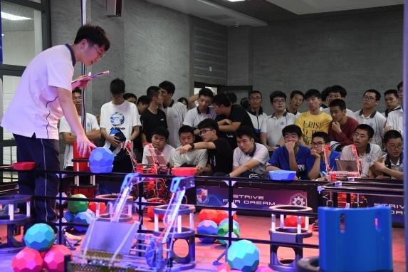 首先,福州三中的同學(xué)向教育技術(shù)系師生講解機(jī)器人籃球聯(lián)賽的比賽規(guī)則,并拉開了一場(chǎng)融合了人工智能與算法、機(jī)器人控制技術(shù)與傳感技術(shù)的機(jī)器人籃球賽的帷幕。