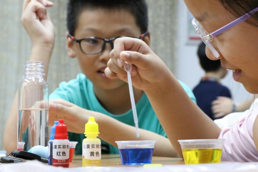 在感受了大運(yùn)河文化的魅力之后,實(shí)踐團(tuán)隊(duì)又帶領(lǐng)小朋友們走進(jìn)了神奇的科學(xué)世界。第一個(gè)科學(xué)實(shí)驗(yàn)是關(guān)于三原色的小實(shí)驗(yàn)。實(shí)驗(yàn)臺(tái)上擺放著三種顏色的液體,有藍(lán)色、黃色、紅色。講解員先向小朋友們介紹了三原色的概念,然后開始演示實(shí)驗(yàn)。只見他們將不同的液體倒入一個(gè)透明的玻璃杯中,神奇的現(xiàn)象發(fā)生了:混合的液體形成了新的顏色。在實(shí)踐團(tuán)隊(duì)成員的指導(dǎo)下,小朋友們親自動(dòng)手進(jìn)行實(shí)驗(yàn),感受著科學(xué)的奇妙。