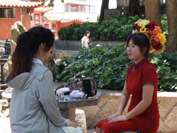圖為實踐隊員在開元寺對游客進(jìn)行專訪 王嶸璇 攝