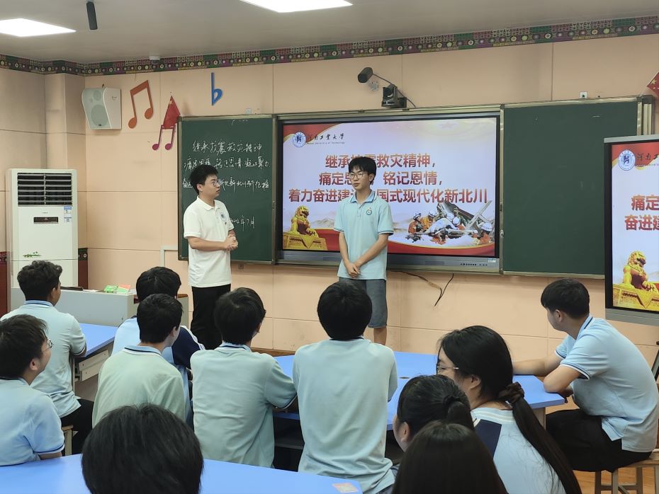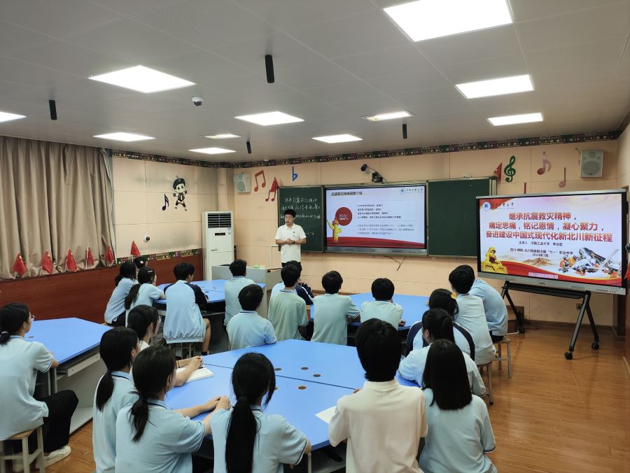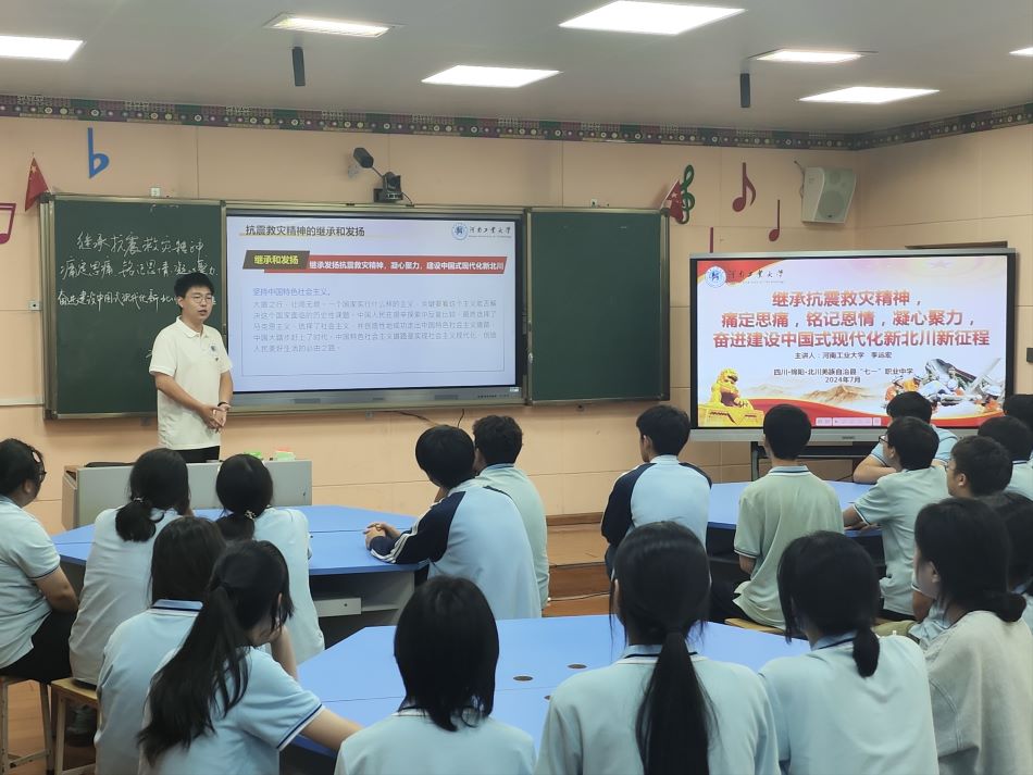 為弘揚偉大的抗震救災(zāi)精神,激發(fā)青少年積極投身中國式現(xiàn)代化新北川建設(shè)的熱情,2024年7月8日,河南工業(yè)大學(xué)“鄭在阿壩·匯流映川”赴川西地區(qū)社會實踐團(tuán)隊于前往北川羌族自治縣七一職業(yè)中學(xué)同上一堂主題為《繼承抗震救災(zāi)精神,痛定思痛,銘記恩情,凝心聚力,奮進(jìn)建設(shè)中國式現(xiàn)代化新北川》的思政課,思政課由河南省“青馬工程”高校班學(xué)員、團(tuán)隊隊長李遠(yuǎn)宏主講,團(tuán)隊全體成員和北川七一職中部分學(xué)生參加。