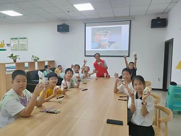 志愿者以飽滿的熱情和生動(dòng)的講解,引領(lǐng)著小朋友們踏入科學(xué)的神秘世界。她用通俗易懂的語言,將復(fù)雜的科學(xué)原理轉(zhuǎn)化為一個(gè)個(gè)有趣的小故事,讓小朋友們聽得入神。小朋友們眼中閃爍著好奇的光芒,紛紛動(dòng)起手來,把透明膠貼在紙杯底部,拿起手中的筆,在透明膠上用心地畫出自己心中喜愛的圖案。當(dāng)手電筒的光線透過紙杯投射而出,那些充滿想象力的圖案瞬間躍然于桌面之上,仿佛是一個(gè)個(gè)夢(mèng)幻的精靈在歡快跳躍。孩子們興奮地歡呼著,自豪地展示著自己的作品,笑容如同綻放的花朵般燦爛。活動(dòng)室內(nèi)充滿了歡聲笑語,那是童真與科學(xué)碰撞出的美妙樂章。在實(shí)驗(yàn)課后,志愿者向小朋友們簡(jiǎn)要介紹了實(shí)驗(yàn)背后的原理和科學(xué)知識(shí)。