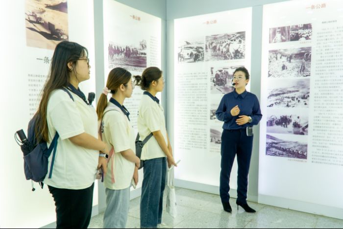 在講解員的帶領(lǐng)下,實(shí)踐隊(duì)師生參觀學(xué)習(xí)了“一位將軍”“一條公路”“一個(gè)奇跡”“一段歷史”“一座新城”五個(gè)板塊主題展,了解筑路大軍在財(cái)力匱乏、技術(shù)短缺、自然環(huán)境極為惡劣的情況下,齊心協(xié)力征服重重天險(xiǎn),創(chuàng)造公路建設(shè)史上的奇跡,以及青藏公路與格爾木市的不解之緣。館內(nèi)陳列展出的的格爾木第一批住房“帳篷”、慕生忠將軍種下的第一棵樹照片、慕生忠將軍插在格爾木的鐵鍬模型,讓實(shí)踐隊(duì)深刻了解了青藏公路從零到有的筑路歷程,身臨其境般體驗(yàn)到青藏公路修建的艱辛。