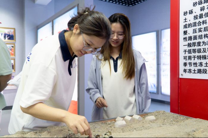 實(shí)踐隊(duì)來到格爾木總段公路文化展示館。館內(nèi)展出的大大小小的沙盤模型和“老物件”,都是格爾木總段職工親手制作以及捐贈(zèng)的珍貴物品。四個(gè)不同時(shí)期的公路沙盤讓實(shí)踐隊(duì)員們了解了格爾木公路的發(fā)展歷史,格爾木總段護(hù)路工人吳戰(zhàn)瑞、車慶禮等的故事讓實(shí)踐隊(duì)員們感受到護(hù)路工人的堅(jiān)守,新舊修路機(jī)械、養(yǎng)護(hù)機(jī)械的對(duì)比讓隊(duì)員們感受到筑路和修路的不易。這里的每一件展品都像是一位無聲的講述者,訴說著那段波瀾壯闊的歷史。