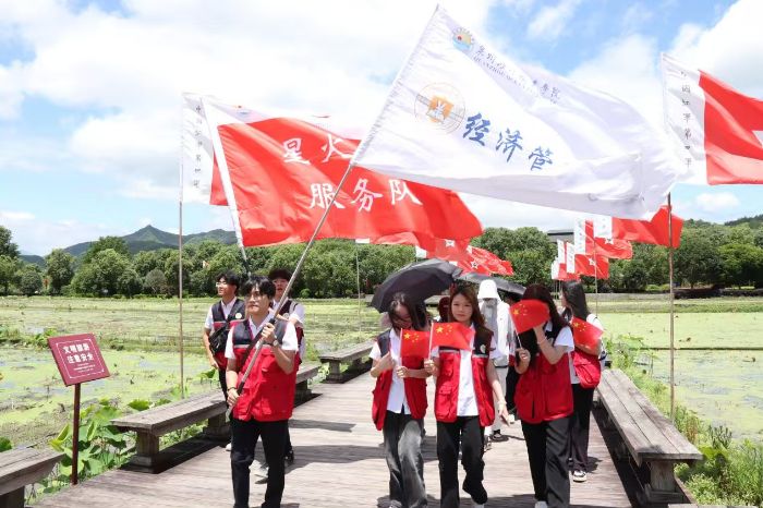 (圖為服務(wù)隊(duì)成員開(kāi)展暑期“三下鄉(xiāng)”出征儀式)
