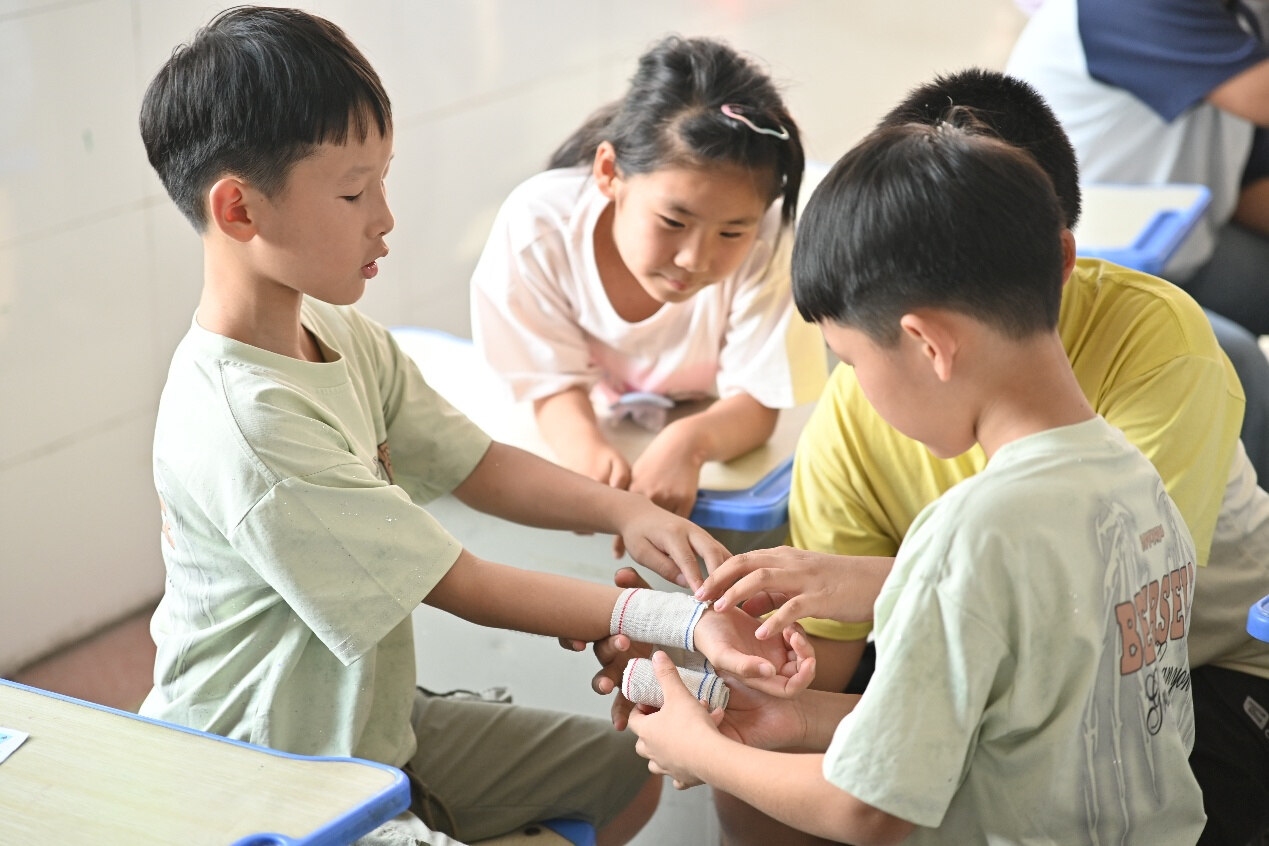 圖為小朋友正在練習(xí)螺旋包扎法操作 陳立志 農(nóng)姚 攝