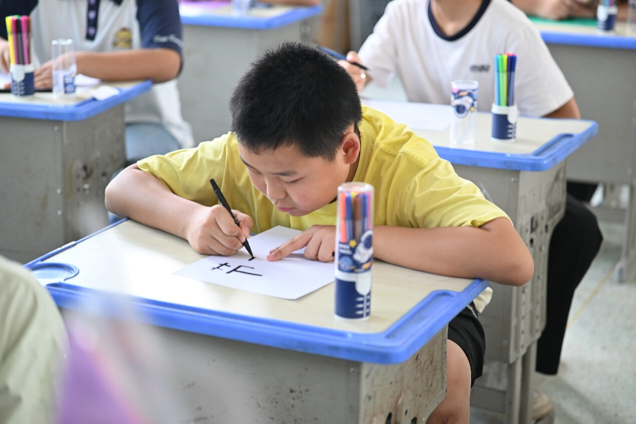 圖為小朋友正在手工課上寫下山明水秀的標(biāo)語 陳立志 農(nóng)姚 攝