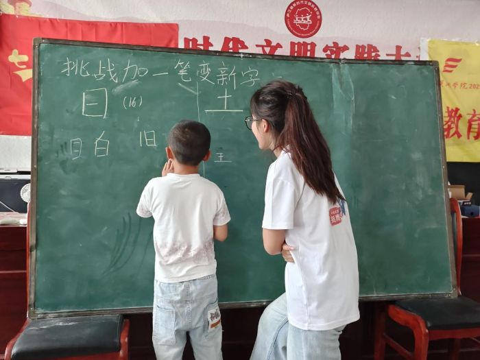 隨后的“加一筆變新字”游戲里,實(shí)踐團(tuán)成員先以“日”“木”等常見(jiàn)字為例演示,引導(dǎo)孩子們打開(kāi)思路。孩子們紛紛舉手嘗試,在“日”字上添畫(huà)幾筆變出“目”“田”,給“木”字稍作改動(dòng)化為“本”“禾”,在一次次新奇的發(fā)現(xiàn)中,笑著觸摸到漢字構(gòu)造的巧思。