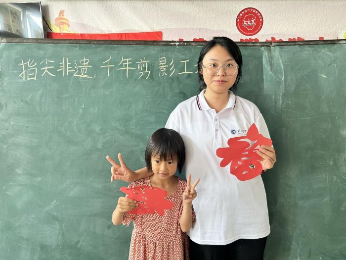 《指尖非遺·千年剪影工坊》課堂里,實(shí)踐團(tuán)成員先向孩子們介紹剪紙這一非遺技藝的歷史淵源,展示了福字、錦鯉魚(yú)等經(jīng)典剪紙作品的范例。隨后,實(shí)踐團(tuán)成員耐心講解彩紙對(duì)折、線條勾勒、剪刀運(yùn)用等基礎(chǔ)技巧,并強(qiáng)調(diào)安全使用剪刀的注意事項(xiàng)。孩子們專(zhuān)注地跟著實(shí)踐團(tuán)成員的步驟操作,從最初小心翼翼地裁剪,到逐漸熟練地掌控剪刀,一張張紅紙?jiān)谒麄兪种新鬓D(zhuǎn),最終幻化出獨(dú)屬于每個(gè)人的奇思妙想。完成作品后,孩子們紛紛舉起自己的成果,興奮地與同伴分享,感受著非遺技藝帶來(lái)的魅力。