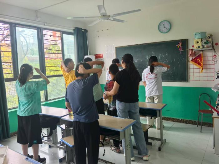 ??????? 圖為南工學子與學生一起做運動。張漢榮 供圖