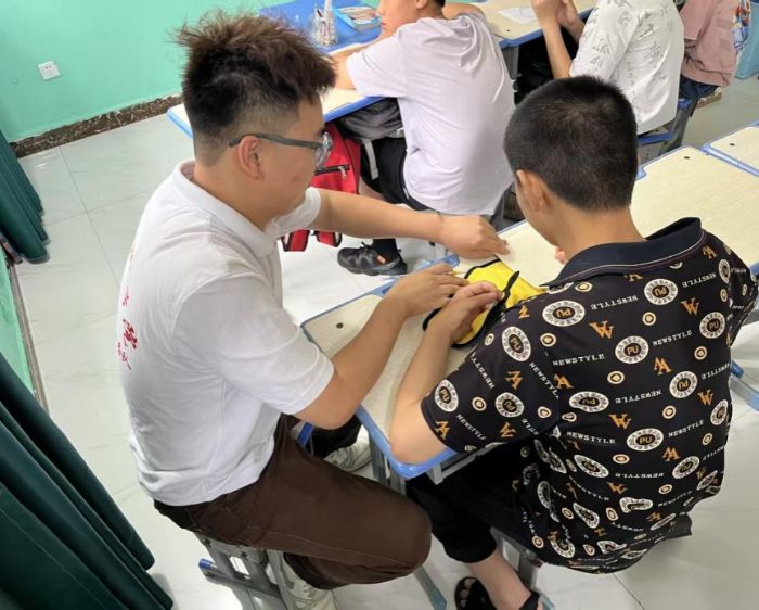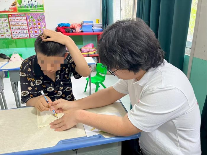 ??????? 圖為南工學子教學生握筆。左進勝 供圖