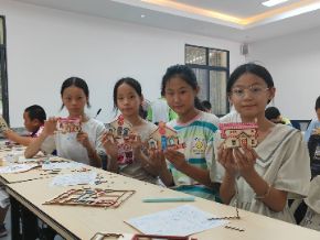 實踐隊員通過 “講解 + 示范 + 實操” 模式開展教學:在漆扇課上示范基礎筆法與色彩搭配,指導孩子們完成個性化創(chuàng)作;借助分解圖講解紙質(zhì)模型組裝邏輯,幫助掌握空間構建技巧;從折紙基礎教起傳授剪紙紋樣技法,讓傳統(tǒng)工藝在指尖傳承。課堂互動中,孩子們專注投入的神情與作品完成后的雀躍反響,成為山區(qū)校園里的暖心風景。?