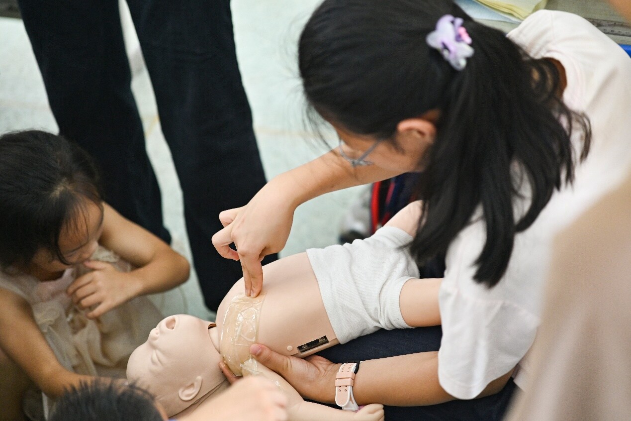 圖為小朋友們親自練習(xí)嬰兒海姆利克急救法 陳立志 農(nóng)姚 攝