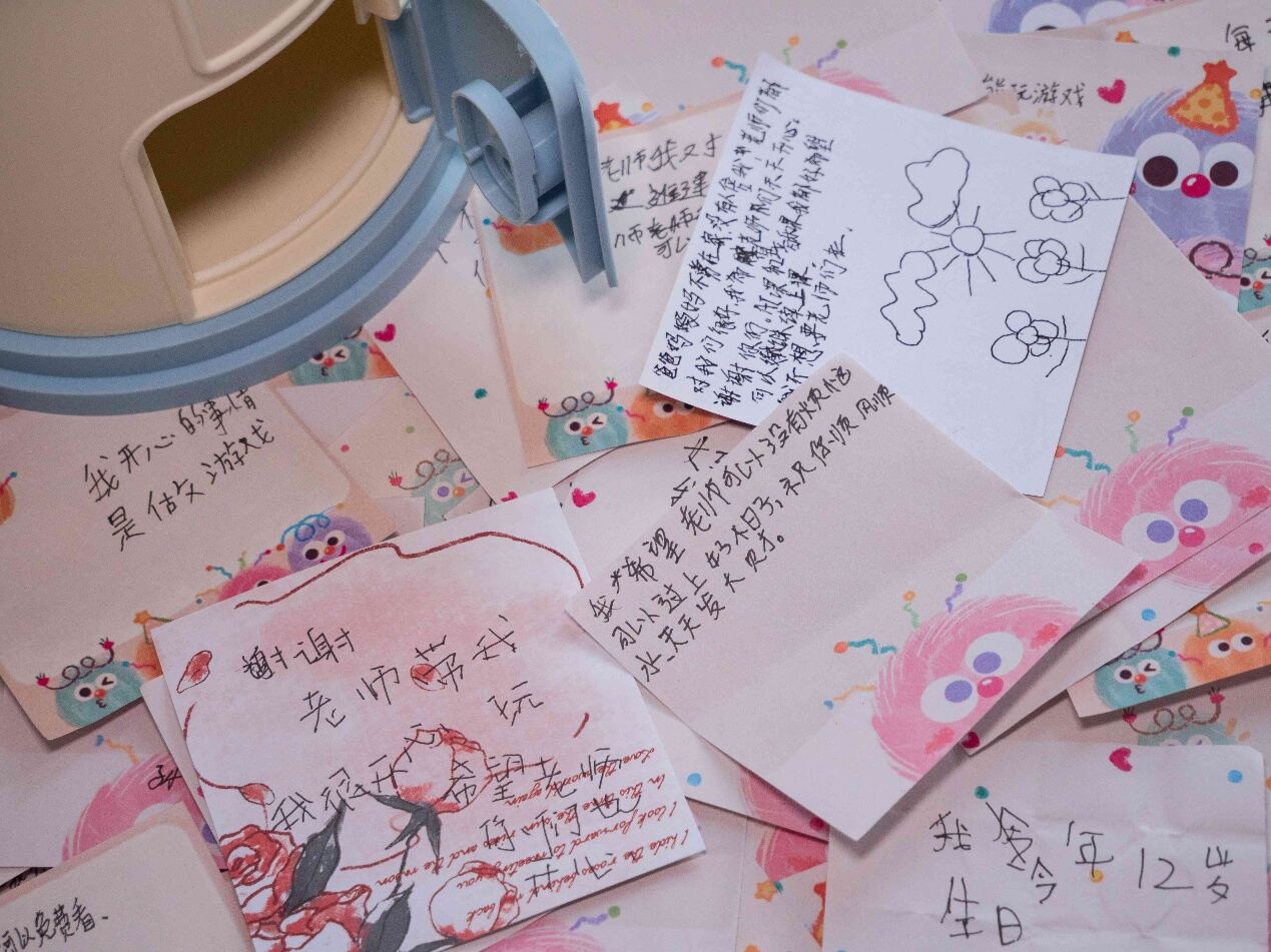 “煩惱盒子”環(huán)節(jié)開啟。孩子們將寫有煩惱的紙條投入小郵筒,完成“煩惱郵寄”。接著,用彩色便利貼記錄開心事,投入另一盒子。老師隨機(jī)朗讀:“今天AI課太好玩了!”“我很喜歡老師們!你們總是給我支持。”笑容氤氳了整個(gè)教室。這些微小的快樂碎片,如繁星匯聚,照亮心房,驅(qū)散陰霾。
