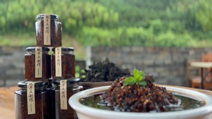 在蒙峒古村,村民嬌姐現(xiàn)場展示了紫蘇醬的古法制作過程。鐵鍋中,紫蘇醬翻騰,香氣四溢。嬌姐詳細(xì)講解了古法配比與熬制訣竅,隊(duì)員們與之緊密協(xié)作,用鏡頭精準(zhǔn)捕捉每一道工序。這些影像資料不僅記錄下傳統(tǒng)技藝的精髓,更成為傳承非遺美食文化的有力載體,讓更多人有機(jī)會了解和喜愛壯鄉(xiāng)美食。