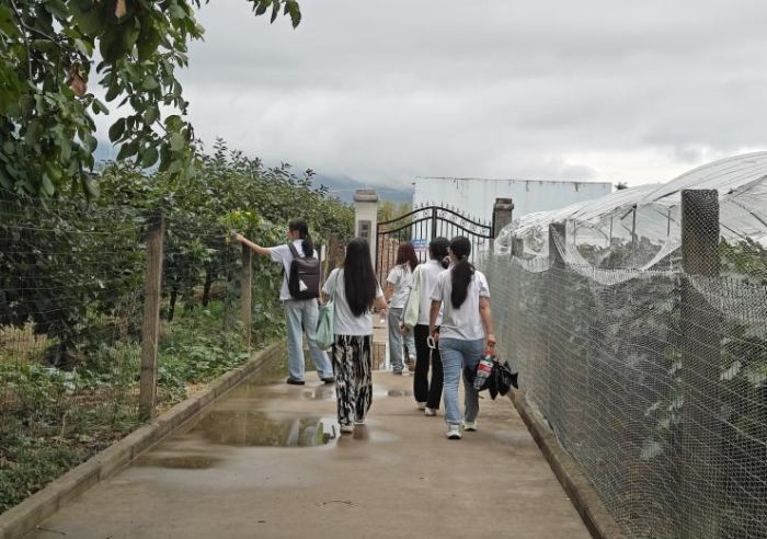 實(shí)踐隊(duì)成員參觀栗峪口村葡萄生產(chǎn)農(nóng)地 周銀秋攝 面對(duì)困難,村集體發(fā)揮了核心引領(lǐng)作用。一方面,堅(jiān)定貫徹“綠水青山就是金山銀山”理念,嚴(yán)格保護(hù)生態(tài)環(huán)境,為產(chǎn)業(yè)發(fā)展筑牢根基。另一方面,積極對(duì)接政策資源,完善基礎(chǔ)設(shè)施,優(yōu)化營商環(huán)境,并采用“村集體+企業(yè)+農(nóng)戶”等合作模式,有效整合資源、降低風(fēng)險(xiǎn)。由村集體牽頭,成功引進(jìn)了“土錘咖啡”等品牌運(yùn)營商,共同盤活了村內(nèi)閑置房屋和土地資源。