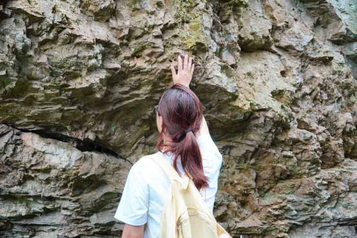 觸覺:觸碰時(shí)光沉淀的溫度 觸摸鼎湖峰的石壁,團(tuán)隊(duì)成員們感受其粗糙質(zhì)感及風(fēng)雨、地殼運(yùn)動(dòng)留下的痕跡。在朱潭山,他們體驗(yàn)了溪水的清涼及水流中砂石輕擦皮膚的感覺,研究水流對(duì)周邊生態(tài)環(huán)境的影響。據(jù)了解,景區(qū)水質(zhì)常年保持Ⅱ類以上,以此保持景區(qū)生態(tài)環(huán)境的質(zhì)量。成員們還觸摸了倪翁洞的鐘乳石,感受其溫潤(rùn)質(zhì)感,以及巖宕書房巖壁上的采石鑿痕,對(duì)比不同年代鑿痕的工具特性,還原古代采石工藝。觸覺調(diào)研使團(tuán)隊(duì)成員對(duì)仙都的自然地質(zhì)和歷史文化有了更直觀、更深刻的認(rèn)識(shí),收獲了關(guān)于巖石、水流和書法等方面的實(shí)踐知識(shí)。