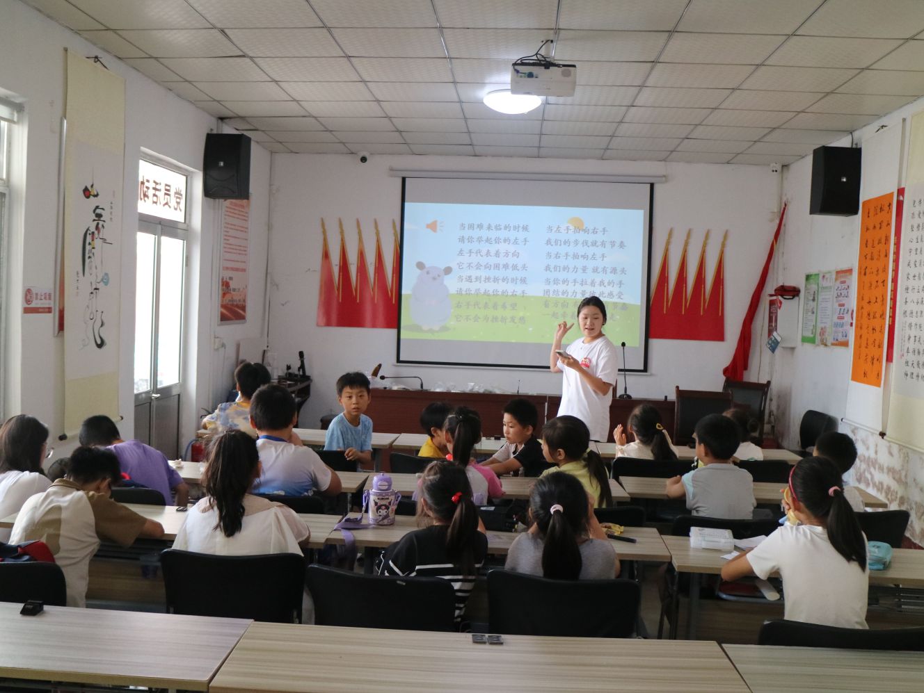 紅色課程結束后,實踐團成員張舒涵、曹孟肖、孫銘悅帶領孩子們回顧《左手右手》這首歌。他們先播放歌曲旋律,引導學生跟著哼唱,隨后為歌曲設計了一系列貼合歌詞意境的動作——當唱到“當你的手拉著我的手”時,孩子們兩兩相握。成員們耐心講解每個動作的要領,糾正孩子們的姿勢,鼓勵他們邊唱邊做,為后續(xù)的唱歌演出打下基礎。