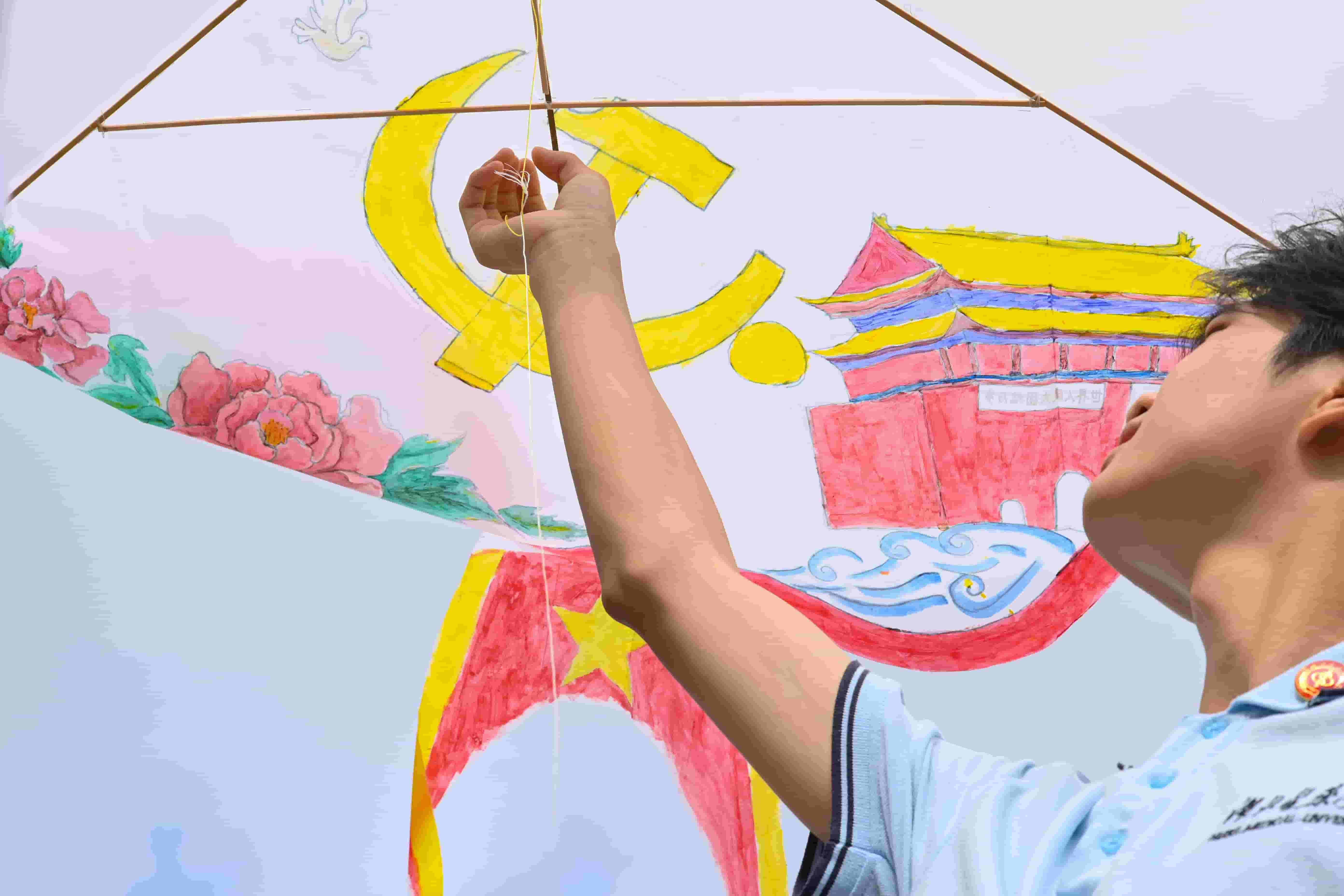 “箏”心筑夢環(huán)節(jié)里,空白風箏面在孩子們眼中成了施展創(chuàng)意的天地。四個孩子自發(fā)圍攏,在隊員羅錦旺、趙政的引導下,用畫筆蘸取五彩顏料,以天馬行空的想象勾勒圖案。沒有刻意安排分工,協(xié)作卻自然發(fā)生:有人畫翅膀,有人描云朵,有人補色彩,默契在畫筆流轉(zhuǎn)間悄然滋生。風箏試飛時幾次搖晃下墜,孩子們卻不氣餒,學著調(diào)整方向、收放絲線,終于讓彩鳶“咬”住風,舒展翅膀沖上藍天。操場上瞬間爆發(fā)出歡呼,孩子們仰著紅撲撲的臉蛋,目光追隨著空中的風箏,陽光灑在他們與風箏上,將協(xié)作的智慧、直面挫折的勇氣與夢想成真的喜悅,一同送向晴空。