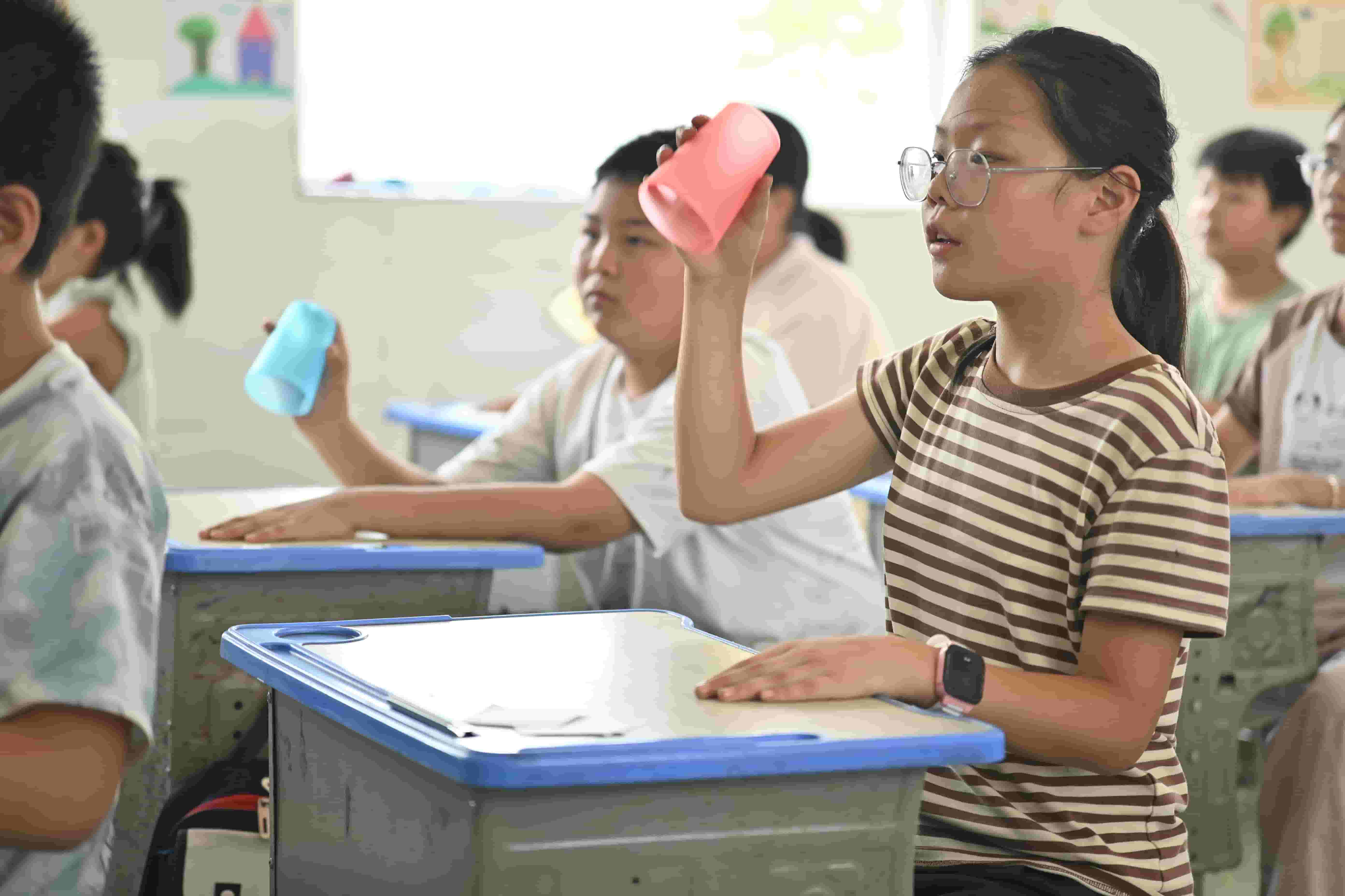 音樂課上,普通的塑料杯變成了“魔法樂器”。在隊員張詩涵的帶領(lǐng)下,孩子們跟著節(jié)奏練習敲擊、翻轉(zhuǎn)、鼓掌。起初教室里“乒乒乓乓”一片雜亂,杯子還總調(diào)皮“逃跑”,但孩子們緊盯老師手勢,反復磨合。很快,“噠——噠噠——啪!”的節(jié)奏從零散變得統(tǒng)一,塑料杯在桌面與掌心間跳躍旋轉(zhuǎn),碰撞出清脆韻律,整個教室沉浸在節(jié)奏狂歡中,笑聲與節(jié)拍交織成最動人的樂章。