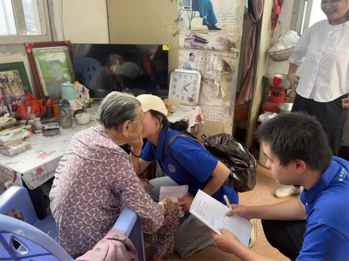 “阿公阿嬤,呷飽未”?”調(diào)研中,不少隊員用流利的閩南話與老人拉家常,親切的稱呼瞬間消弭了陌生感。遇到聽力欠佳的老人,大家便俯下身湊到耳邊,放慢語速大聲“翻譯”;當老人們緩緩道出過往的故事,隊員們始終笑意盈盈,全神貫注地聆聽著每一段過往。隊員們的青春朝氣與真誠陪伴為靜謐的庭院注入陣陣暖意,質(zhì)樸的鄉(xiāng)音化作了連接百年滄桑與蓬勃青春的溫情紐帶。