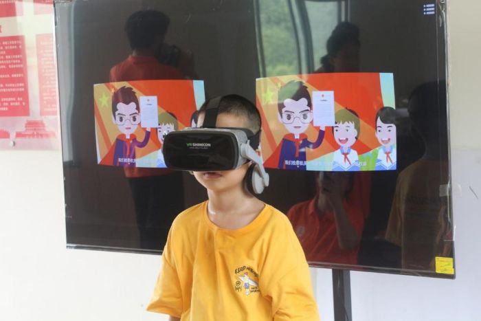 圖為學(xué)生戴著VR眼鏡觀看防校園霸凌短片