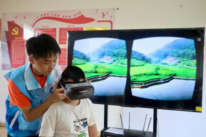 圖為學(xué)生們戴著VR眼鏡看家鄉(xiāng)