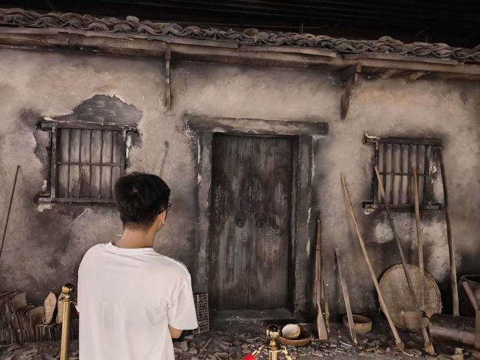 接著志愿者們又來到一處房子模型前,門口有槍、古樸的農(nóng)具和草鞋等,門前散落的鋤頭、掃帚等工具,以及房屋可能作為農(nóng)場或農(nóng)田一部分的暗示,都展現(xiàn)了當時人們自給自足的農(nóng)耕生活方式。這些工具不僅是勞動的象征,也是那個時代人們生存和發(fā)展的重要工具。門上的鎖鏈和關(guān)閉的狀態(tài)可能意味著在特定時期(如戰(zhàn)爭期間),為了安全起見,人們會采取措施限制外來人員的進入。這反映了當時社會的不穩(wěn)定和安全意識的增強。該建筑所傳達的歷史感和懷舊感,能夠引發(fā)人們對過去時代的思考和感慨。它讓人們意識到戰(zhàn)爭的破壞力以及和平生活的珍貴,同時也喚起了對傳統(tǒng)文化的尊重和懷念。