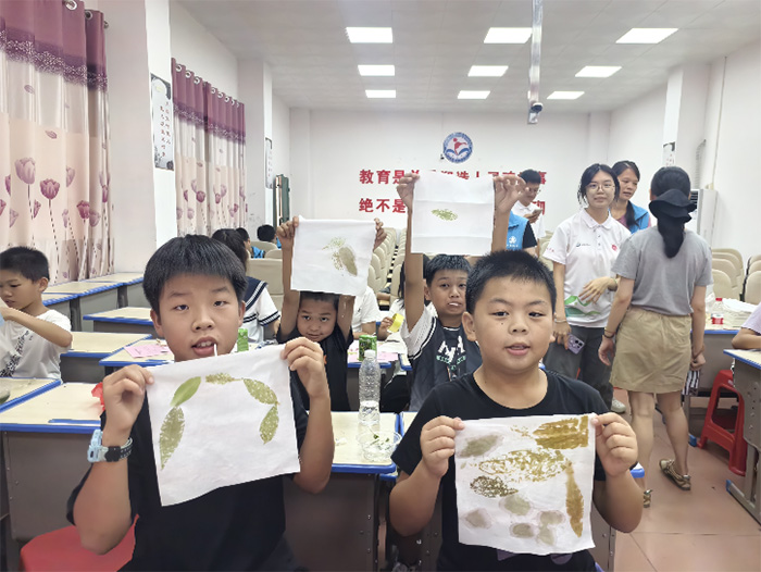 “用錘子敲一敲,花葉就能變印章!”在植物拓印課堂上,孩子們拿起新鮮花葉,在老師指導(dǎo)下將自然紋理印在紙上。翠綠的葉片、鮮艷的花瓣,通過(guò)簡(jiǎn)單的拓印技巧變成獨(dú)特的藝術(shù)品,讓孩子們?cè)趧?dòng)手過(guò)程中感受自然之美,也埋下熱愛(ài)生命的種子。