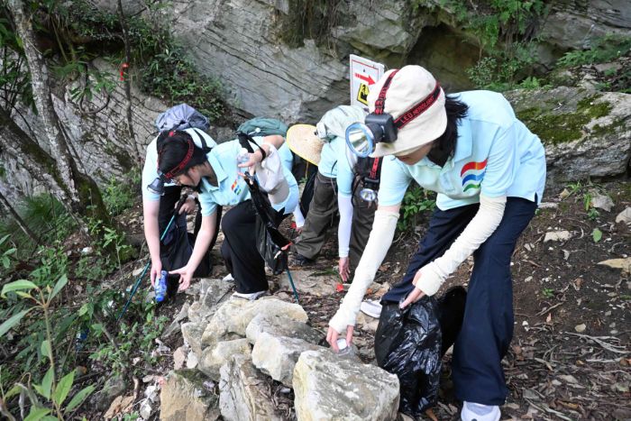 穿越溶洞,實踐團沿著甘香峽谷溪流繼續(xù)前行。隊員們還與沿途游客進行交流,收集他們對徒步路線的體驗反饋與改進建議。徒步期間,團隊成員們發(fā)現(xiàn)步道周邊存在白色垃圾,自發(fā)取出隨身攜帶的垃圾袋,拾起掉落在山間溪邊的塑料瓶、食品包裝袋,將“潔小青”的理念落到實處。