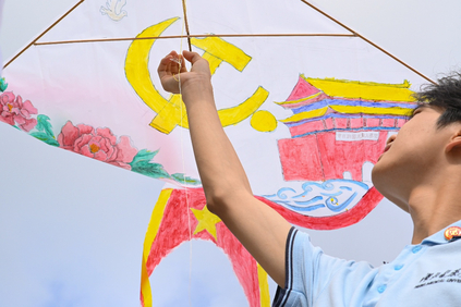 圖為老師牽著做好的天安門風(fēng)箏準備就緒 農(nóng)姚 攝