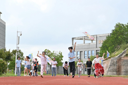 圖為老師帶著孩子們在操場跑道上放飛象征著自己夢想的風(fēng)箏 農(nóng)姚 攝