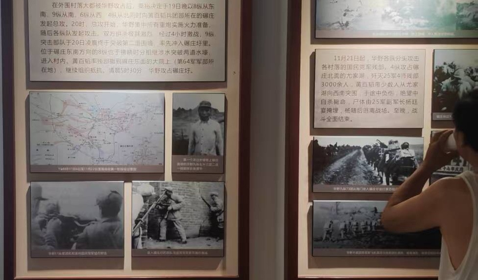 在拍攝過程中,一位老人引起了劉錦怡的注意。老人駐足凝視戰(zhàn)役展板,還不時(shí)與同行好友低聲討論。“這場戰(zhàn)役打的不容易啊……”他的話語中透著對戰(zhàn)役的深刻理解。經(jīng)過交談得知,老人是當(dāng)?shù)赝诵萁處?,對淮海?zhàn)役有著深入研究。“年輕人來做這個(gè)工作很有意義,”老人對實(shí)踐團(tuán)的工作表示贊賞,“把歷史用新技術(shù)保存下來,才能讓后代永遠(yuǎn)銘記。”