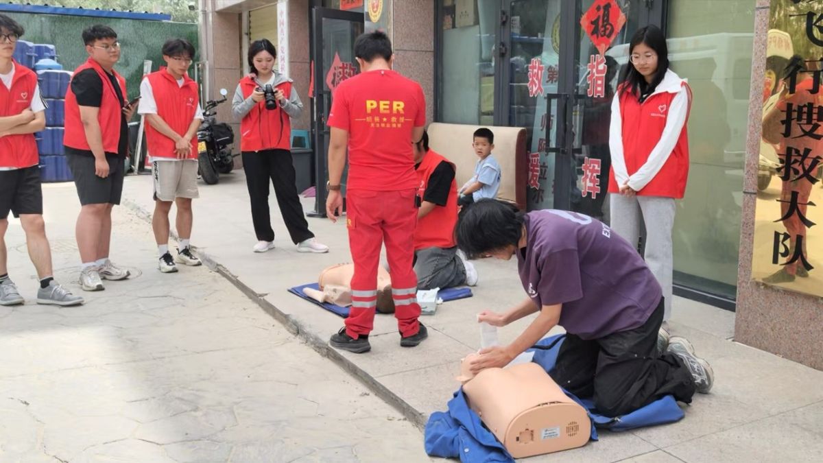 在實踐環(huán)節(jié),成員們分成小組,圍在人體模型前躍躍欲試,卻又難掩緊張。第一個上手的成員手指顫抖著尋找兩乳頭連線中點,按壓時手臂彎曲,力度綿軟。“手臂伸直!用髖關(guān)節(jié)發(fā)力!”老師按住他的肩膀糾正姿勢,“想象你正在挽救的是自己的親人。”成員深吸一口氣,重新調(diào)整姿勢。隨著“1001、1002……1030”的計數(shù)聲,他額頭冒出豆大的汗珠,手臂酸痛到幾乎失去知覺,但他依然咬牙堅持完成整套流程。“原來胸外按壓這么累!但一想到關(guān)鍵時刻能救人,再累也值得。”他揉著手臂,語氣中滿是感慨。
