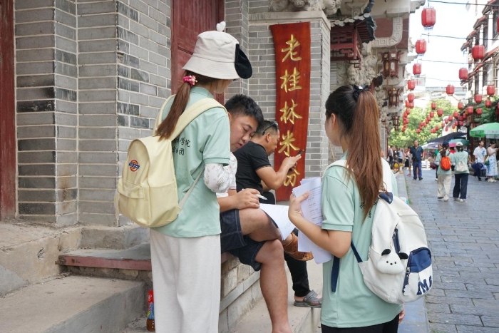 圖為團(tuán)隊(duì)成員向游客發(fā)放調(diào)查問卷